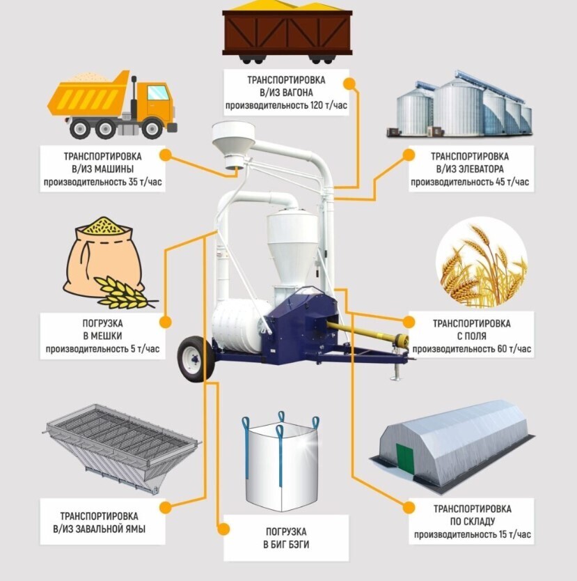 Пневмопогрузчики поставляются производительностью от 30 до 116 тон в час.